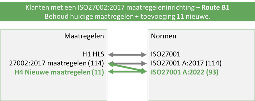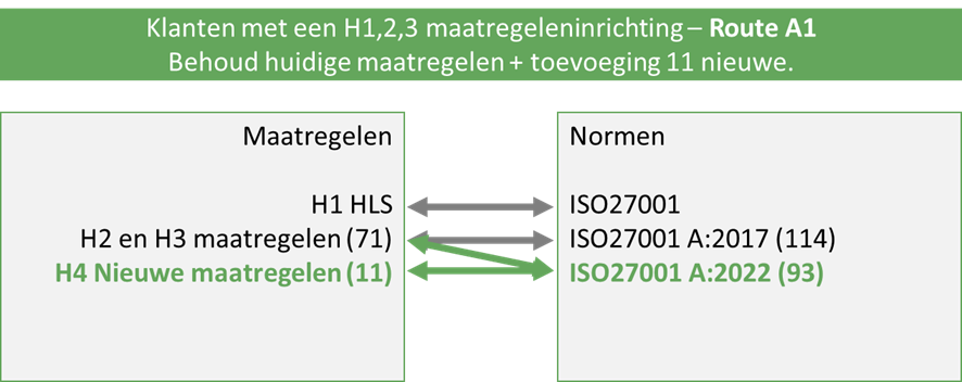 Bij route A1 kiest u ervoor om met uw bestaande inrichting verder te gaan. Aan de normenkant zal ISO27001 A:2022 toegevoegd worden, waarbij de in ISO27002:2022 Annex B beschreven koppelingen meegenomen worden met de ISO27002:2017 maatregelen. Omdat de huidige ISO27002:2017 maatregelenset de ISO27001 A:2022 niet compleet afdekt, wordt er ook een nieuwe maatregelenset van 11 maatregelen toegevoegd. Deze zijn gelijk aan de 11 nieuwe ISO27002:2022 maatregelen en het is van belang dat u deze naar uw eigen organisatie toeschrijft.