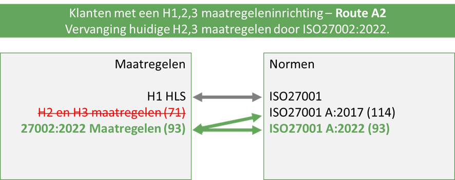 Omdat de ISO27001 A:2017 uit 114 maatregelen bestond, vonden wij 5 jaar geleden dat dit efficiënter kon en hebben in onze standaard maatregelenset hoofdstuk 2 en 3, dit in totaal teruggebracht naar 71 samengevoegde maatregelen. Met de komst van ISO27001 A:2022 zouden dit dus, zoals in route A1 staat beschreven, 82 maatregelen worden.